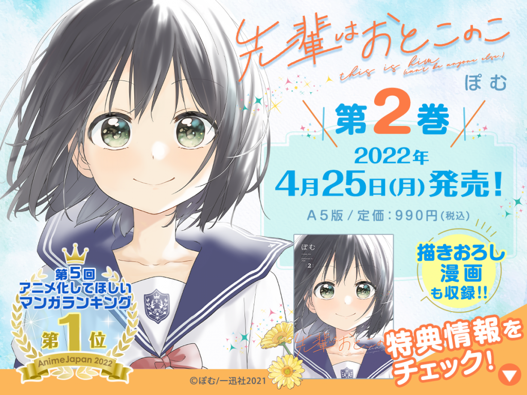 | 【新アニメ】『先輩はおとこのこ』PV&新キャラ公開! 7月4日放送開始 …TVアニメ『先輩はおとこのこ』の最新PVが公開された。エンディング・テーマアーティスト、追加キャラクター&キャストの情報も公開。Netflix、U-… (出典:) |